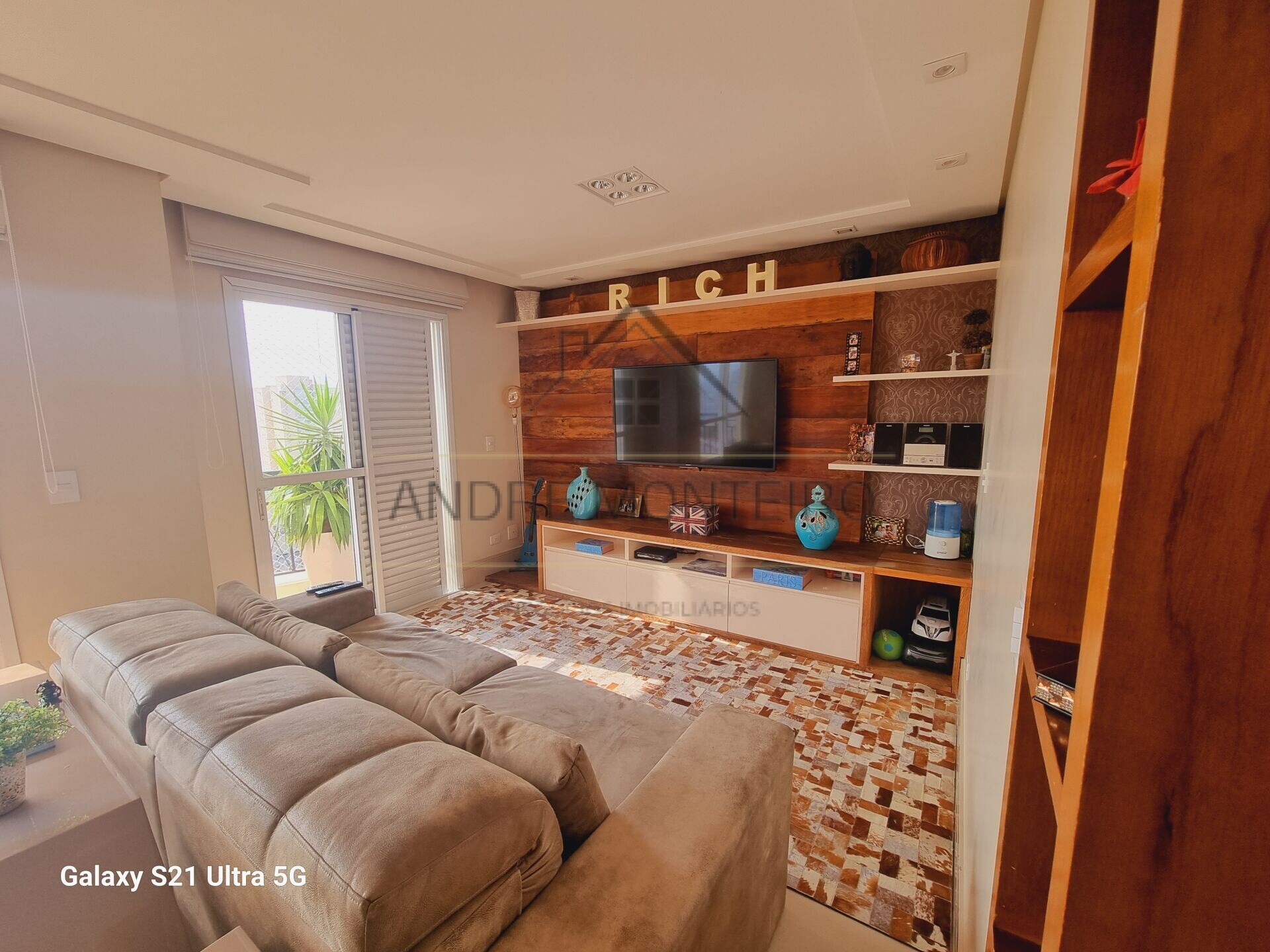 Na sala de TV conts com painel em madeira de demolição legítima.